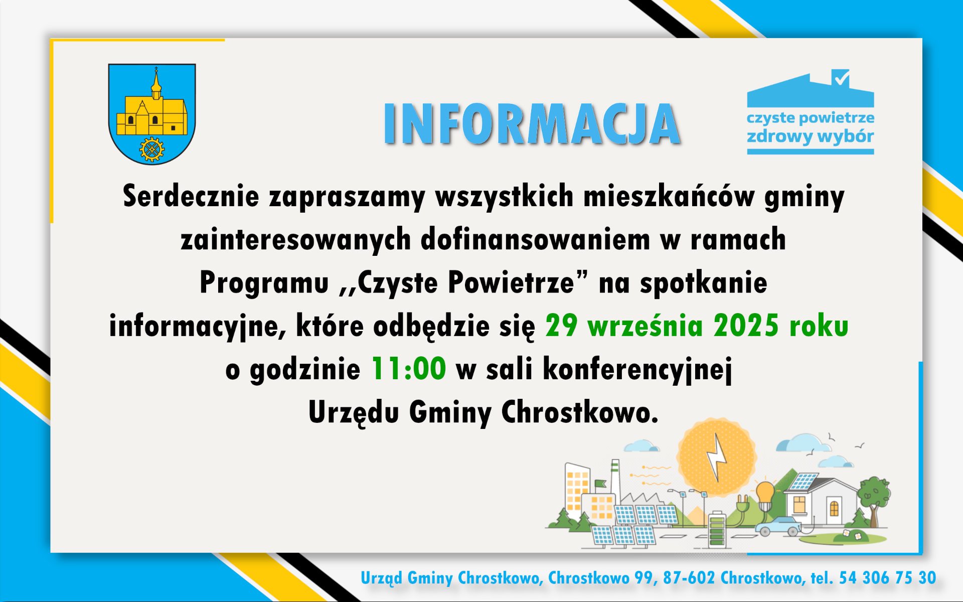 Serdecznie zapraszamy wszystkich mieszkańców gminy zainteresowanych dofinansowaniem w ramach Programu ,,Czyste Powietrze” na spotkanie informacyjne, które odbędzie się 29 września 2025 r.(poniedziałek) o godzinie 11:00 w sali konferencyjnej Urzędu Gminy Chrostkowo.