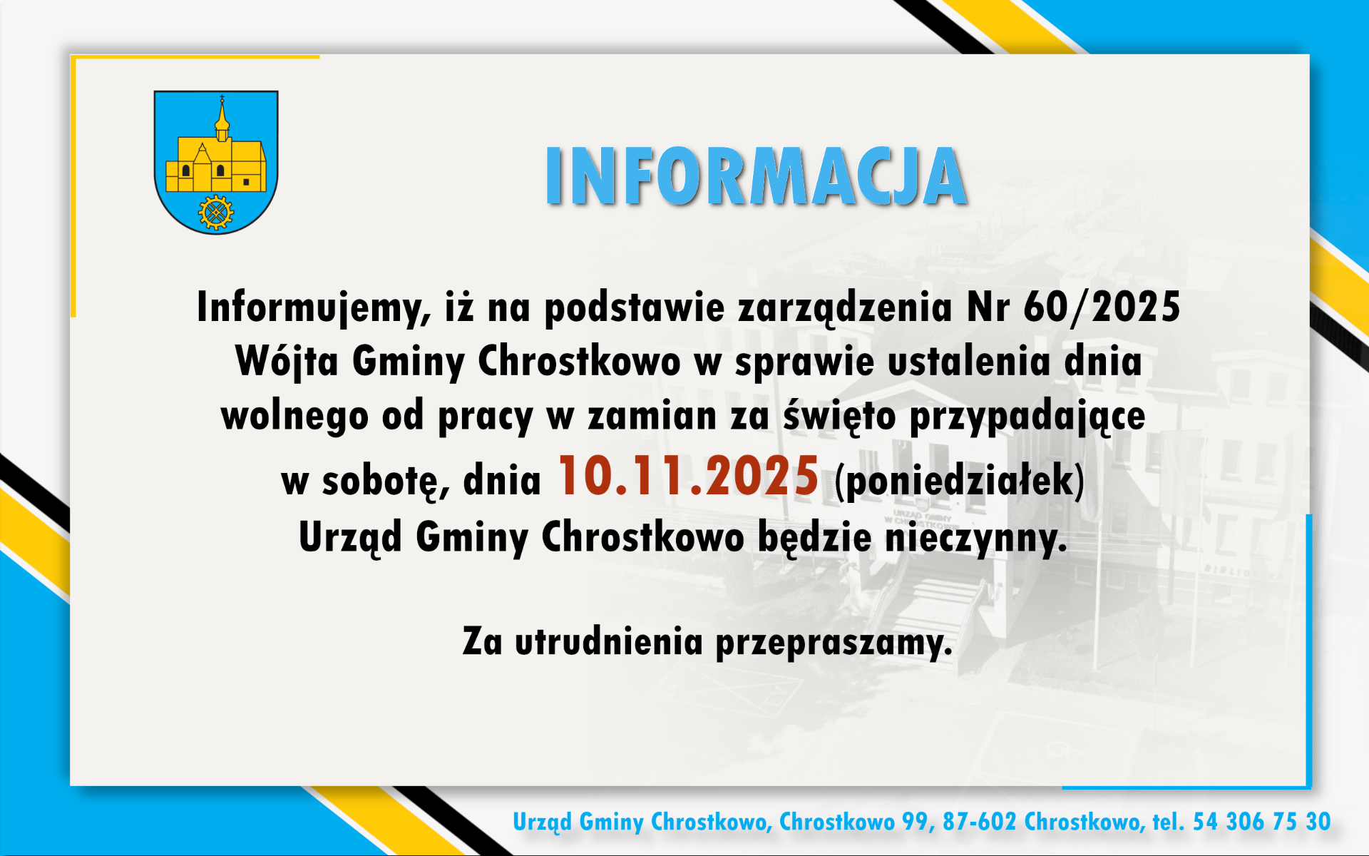 W dniu 10.11.2025 Urząd Gminy Chrostkowo będzie nieczynny.