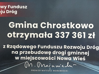 W dniu 13 marca Wójt Gminy Chrostkowo Mariusz Lorenc otrzymał promesę z Rządowego Funduszu Rozwoju Dróg z dofinansowaniem na kolejną drogę. Dodatkowe środki pozwalają nam na wykonywanie większej ilości robót. W imieniu mieszkańców bardzo dziękujemy i prosimy o więcej, gdyż następne drogi w innych miejscowościach czekają na modernizacje.