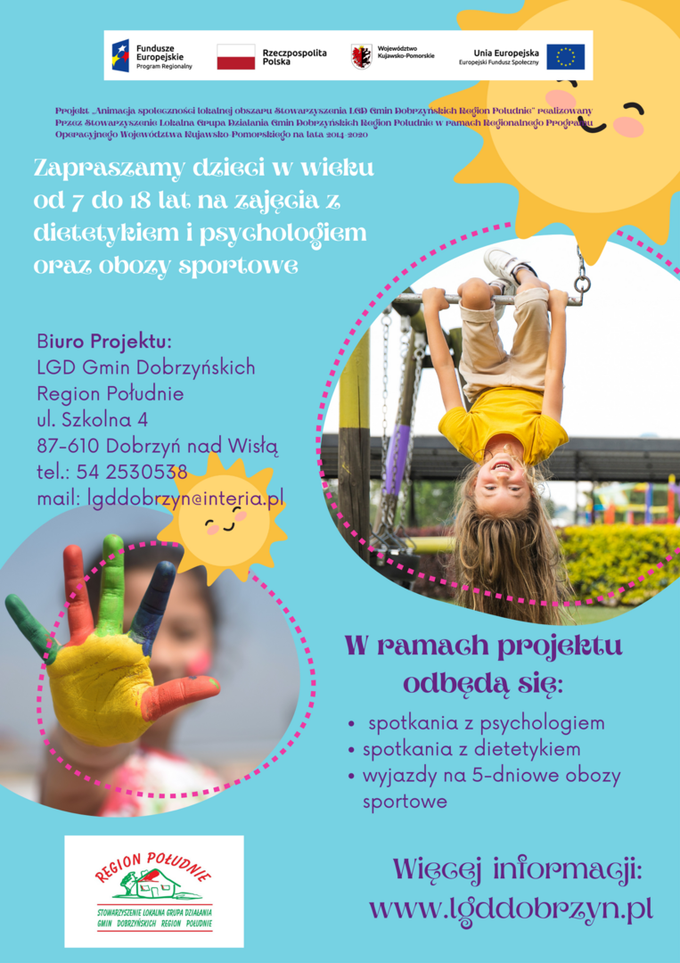 Od 17 marca 2023 r. Lokalna Grupa Działania Gmin Dobrzyńskich Region Południe rozpoczyna rekrutację uczestników do projektu pn. „Animacja społeczności lokalnej obszaru Stowarzyszenia LGD Gmin Dobrzyńskich Region Południe”. Dofinansowanie w kwocie 424 953,88 zł ze środków Europejskiego Funduszu Społecznego za pośrednictwem Regionalnego Programu Operacyjnego Województwa Kujawsko-Pomorskiego na lata 2014-2020 umożliwi w najbliższych 7 miesiącach realizację ciekawych zajęć dla dzieci i młodzieży na terenie gmin objętych LSR: Dobrzyń nad Wisłą, Bobrowniki, Chrostkowo, Kikół, Skępe, Tłuchowo, Wielgie, Czernikowo oraz gminy i miasta Lipno. Dzieci i młodzież w wielu od 7 do 18 lat w ramach projektu otrzymają wsparcie psychologa oraz dietetyka, oraz będą mieli możliwość skorzystania z wyjazdów na 5-dniowy obóz sportowy, podczas których czeka na nie wiele atrakcji i ciekawych zajęć.